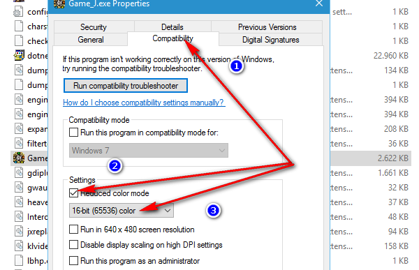 nếu quý nhân sĩ nào muốn chơi ở chế độ 16bit màu từ Windows 8 trở đi thì chọn vào thẻ Compatibility -> Reduced color mode -> chọn 16bit màu.