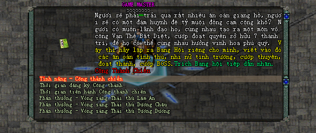 Bang chủ của Bang này sẽ trở thành một trong Thất đại thành chủ, được quyền định giá các vật phẩm NPC, thiết định thuế suất, thụ hưởng hồng lợi trong thành.